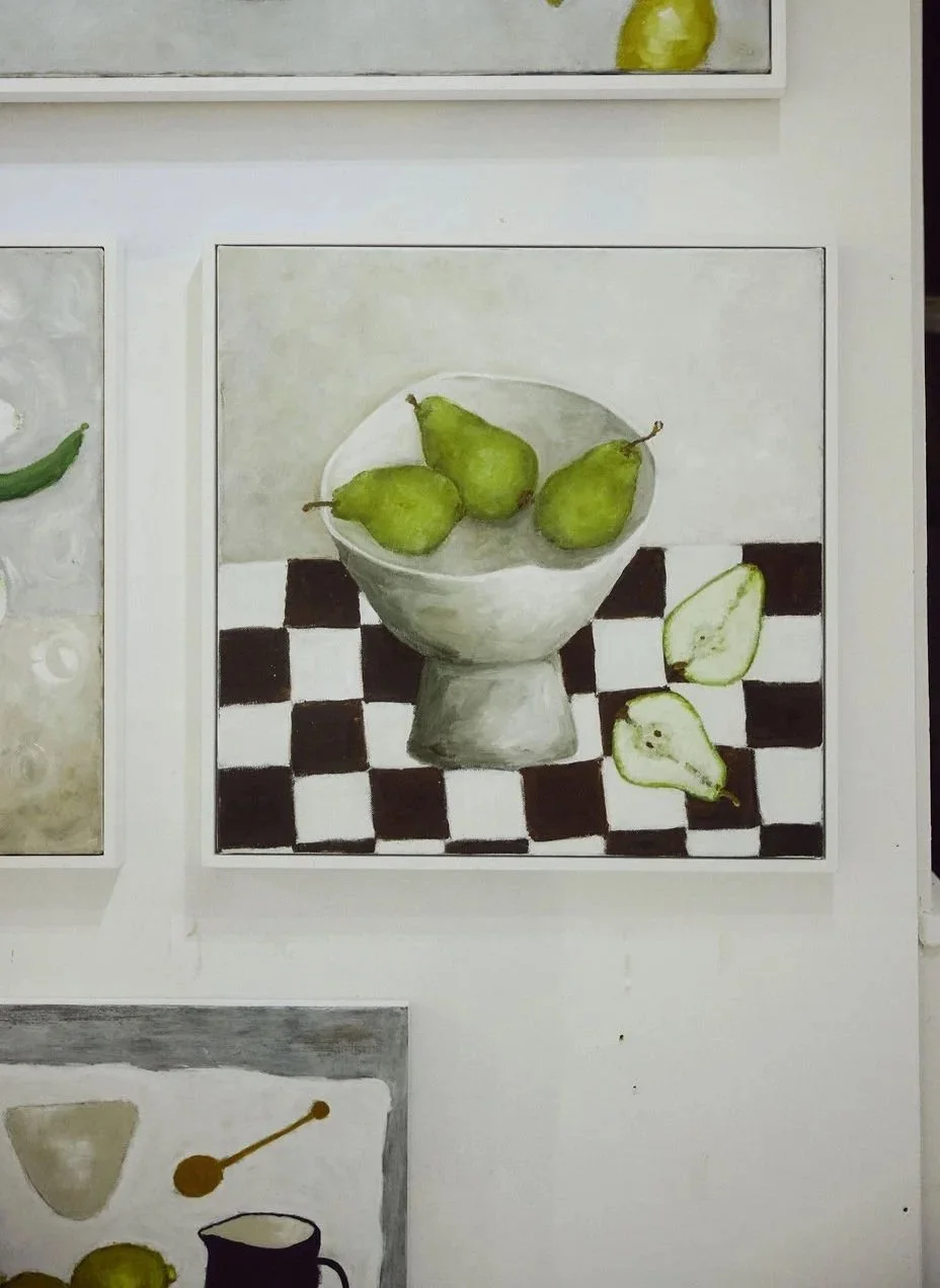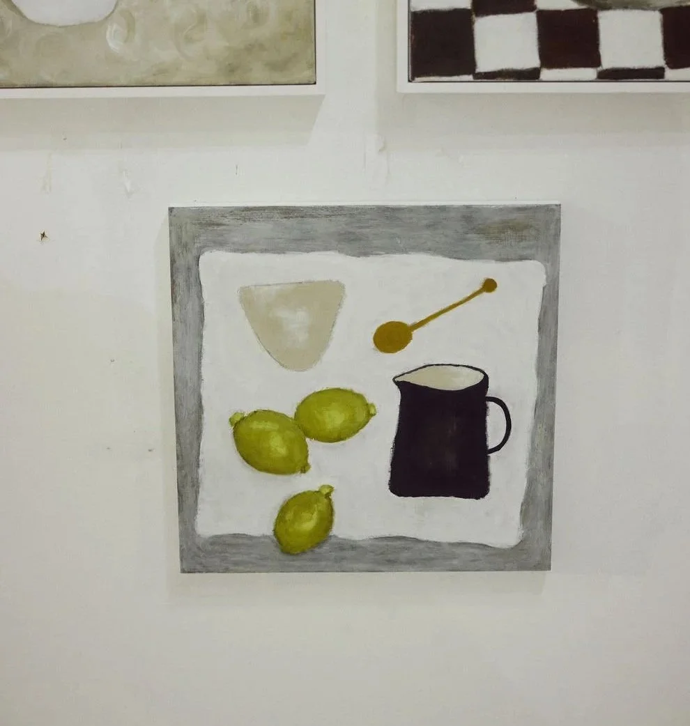 Now I work in oil paint on wooden board .and my practise starts with small story-board sketches, these are influenced by how I see the everyday. Working out the composition and pallet before setting up the still life, just as a food stylist and photographer would arrange a shoot, selecting objects from my kitchen and home. This enables me to create not just from life but also from memory, using my perspective and not just what I see in front of me.